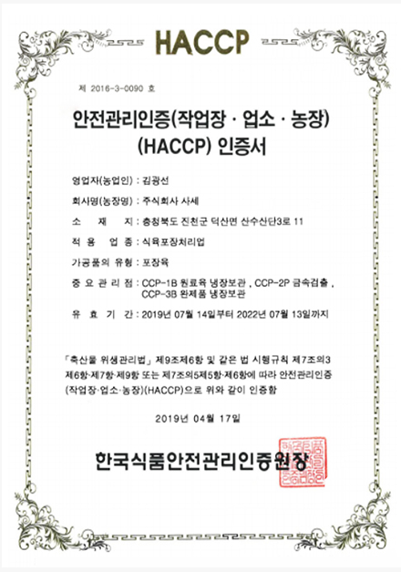 HACCP 인증이란 식품의 원재료부터 제조, 가공, 보존, 유통, 조리단계를 거쳐 최종소비자가 섭취하기 전까지의 각 단계에서 발생할 우려가 있는 위해요소를 규명하고, 이를 중점적으로 관리하기 위한 중요관리점을 결정하여 자율적이며 체계적이고 효율적인 관리로 식품의 안전성을 확보하기 위한 과학적인 위생관리체계입니다.