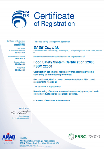 FSSC 22000은 소비자에게 안전한 식품 공급을 보장하기 위해 2000년도에 설립된 GFSI(Global Food Safety Initiative)에서 국제표준인 ISO22000과 TS22000의 요구사항을 충족한 기업에게 인증을 부여하는 제도입니다. 엄격하고 신뢰도 높은 국제 규격으로 전 세계적으로 통용되고 있습 니다.