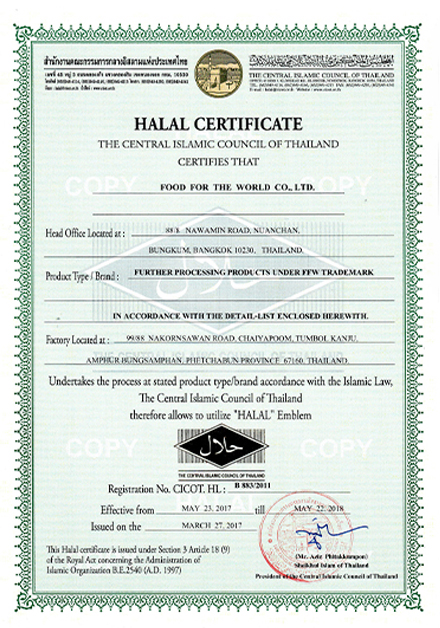 HALAL 인증은 이슬람 종교단체의 규격으로 샤리아 율법에 따라 제조, 가공되었다는 것을 보장하는 인증으로 가공 과정뿐만 아니라 하역 장소, 제조 라인, 창고, 배송까지의 전 과정에 적용되며 HACCP, GHP, ISO 22000, GMP의 기준을 준용한 규격입니다.